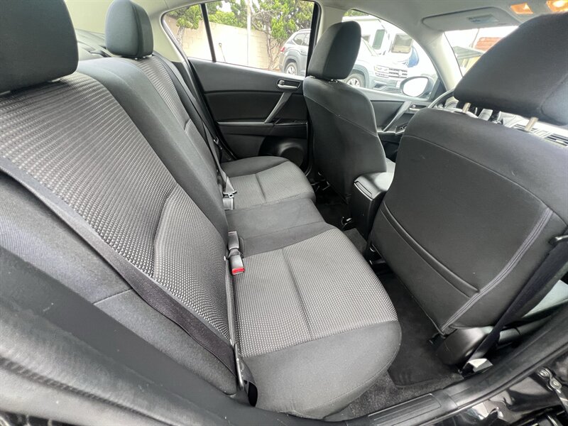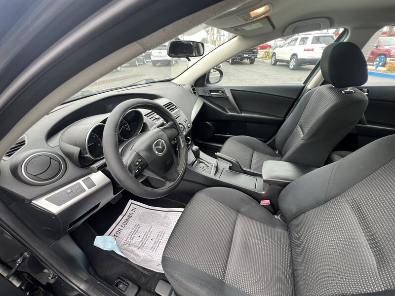 2013 Mazda Mazda3 i SV in Black with Black cloth interior, powered by a 2.0L I4 engine producing 148 hp and 135 lb-ft of torque. Factory standard equipment includes air conditioning, power windows and door locks, remote keyless entry, cruise control, tilt-and-telescoping steering wheel, cloth seating with 60/40 split-fold rear seats, AM/FM/CD/MP3 audio with auxiliary/USB input, Bluetooth hands-free and audio streaming, and steering-wheel-mounted audio/phone controls. Safety and convenience features include ABS, electronic stability and traction control, front and side airbags with side curtain protection, and a tire pressure monitoring system. This vehicle is in excellent overall condition, has good mileage under 133,000 miles (averaging less than 10,000 miles/year), a clean CARFAX, and one prior owner.